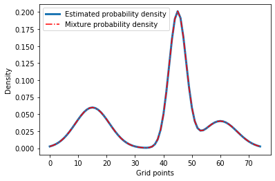 '''Returns the density of a mixture of Gaussians model estimated at grid point t.